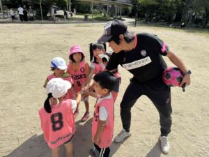 5歳児~小学生のプログラムでは、パスのコツや、パスを受けるときのトラップのコツを教えてもらいました。