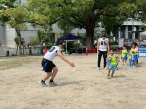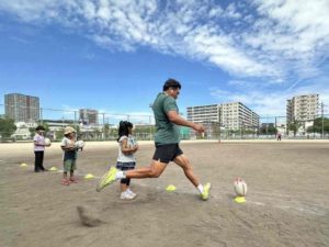 ボールを使ったペアでのメニューや、パス回し、タックル、ディフェンスに捕まらないように線までトライ!など様々な楽しいメニューを行いました!なんと、大西さんによるタックルの実演も!力強さと迫力にみんなびっくりしました👀‼