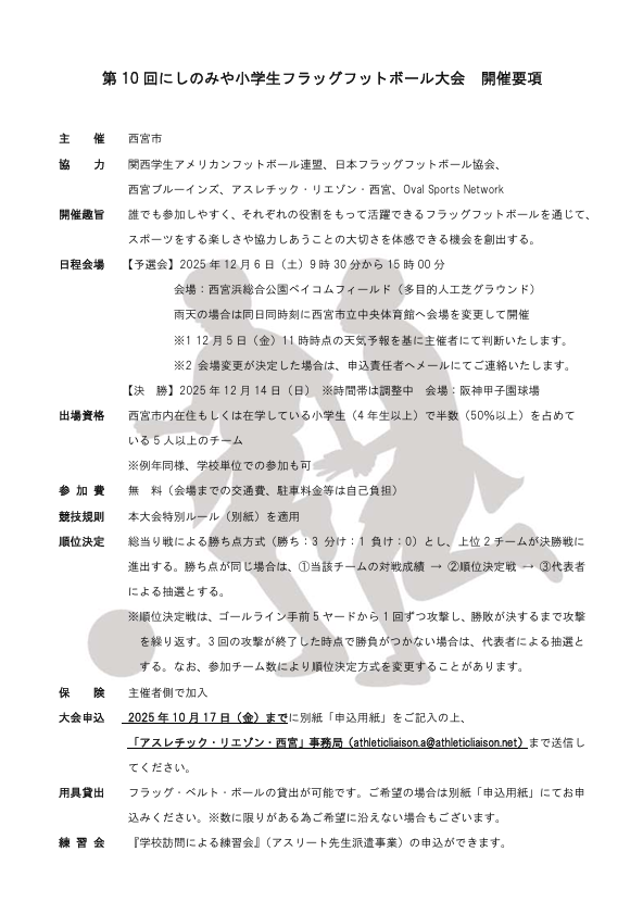 今年で10回目を迎える本大会は、西宮市立小学校を単位としたチームのみではなく、より多くの小学生にフラッグフットボールの試合を体験していただけるよう、学校単位ではない任意チームも対象として実施いたします。