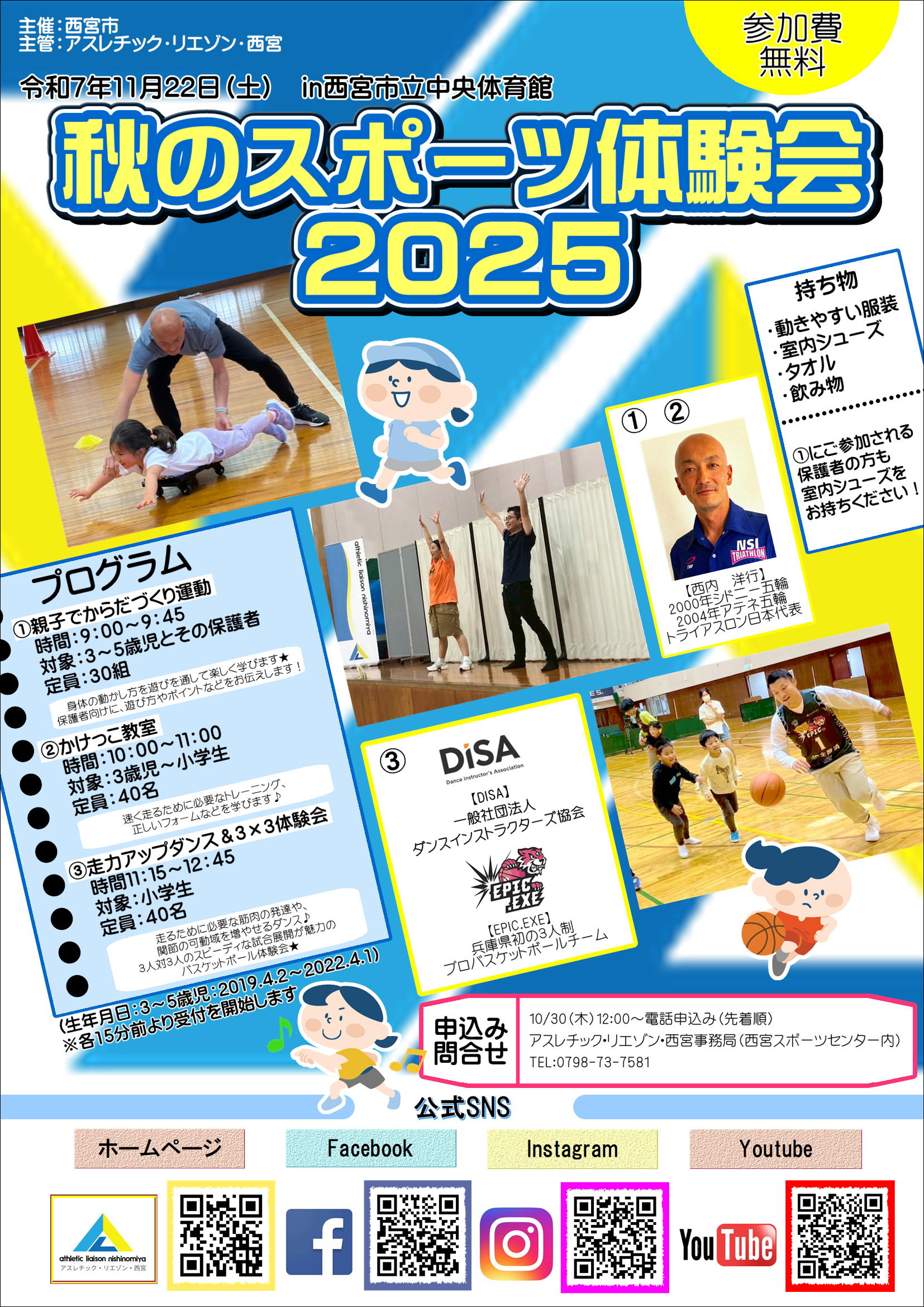 令和7年11月22日(土)西宮市中央体育館にて、【秋のスポーツ体験会2025】を開催します✨