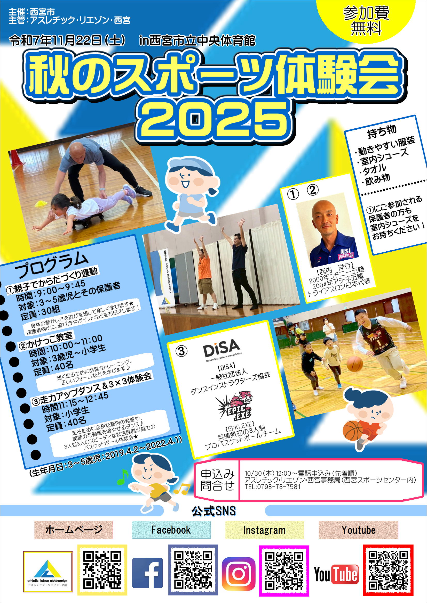 令和7年11月22日(土)西宮市中央体育館にて、【秋のスポーツ体験会2025】を開催します✨