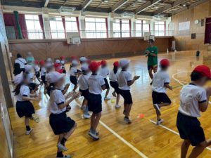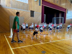 走る前の準備体操で股関節や肩甲骨まわりを動かして、走るのに必要なジャンプの運動やもも上げを行い